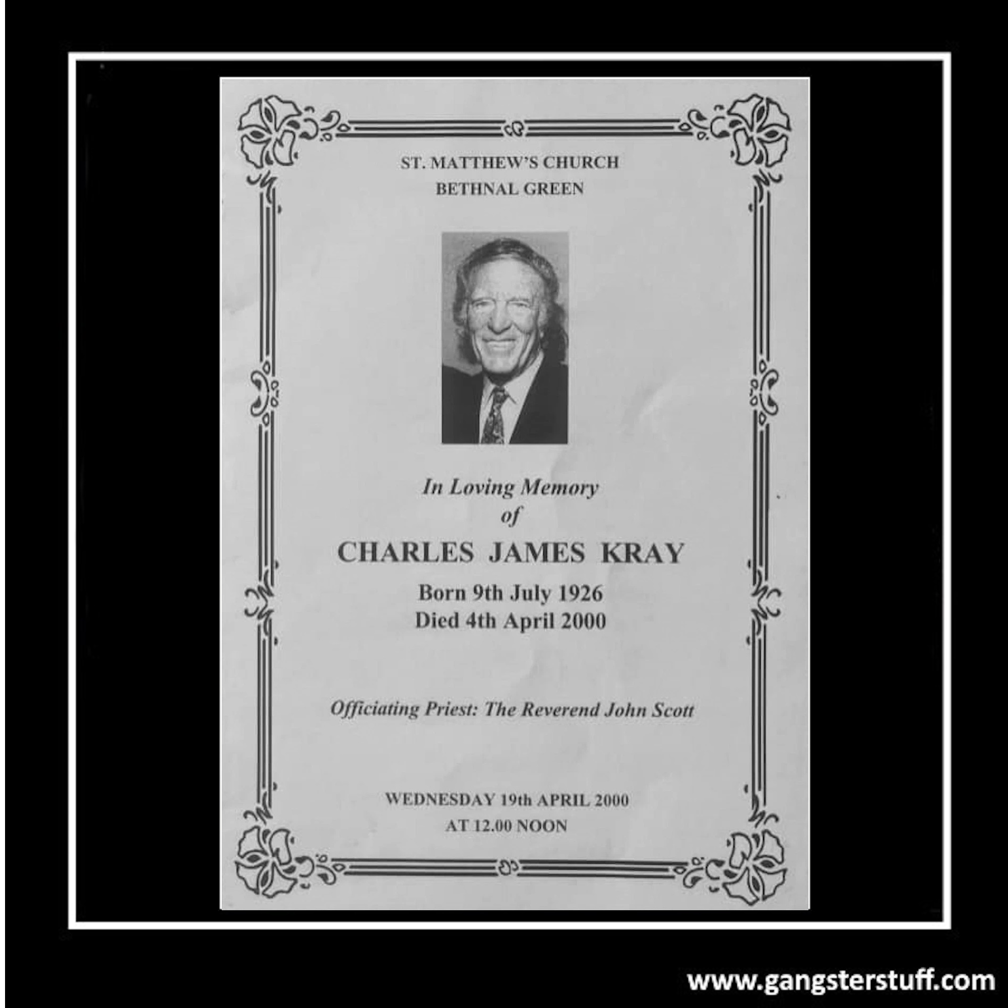 This is a high-quality replica copy of Charlie Kray’s funeral Order of Service, faithfully reproduced to exactly match the original design issued at Charlie Kray’s funeral in April 2000. The replica has been carefully recreated using accurate layout, typography and formatting, making it an excellent display piece for collectors of Kray Twins memorabilia, British crime history enthusiasts, or fans of true-crime ephemera.
