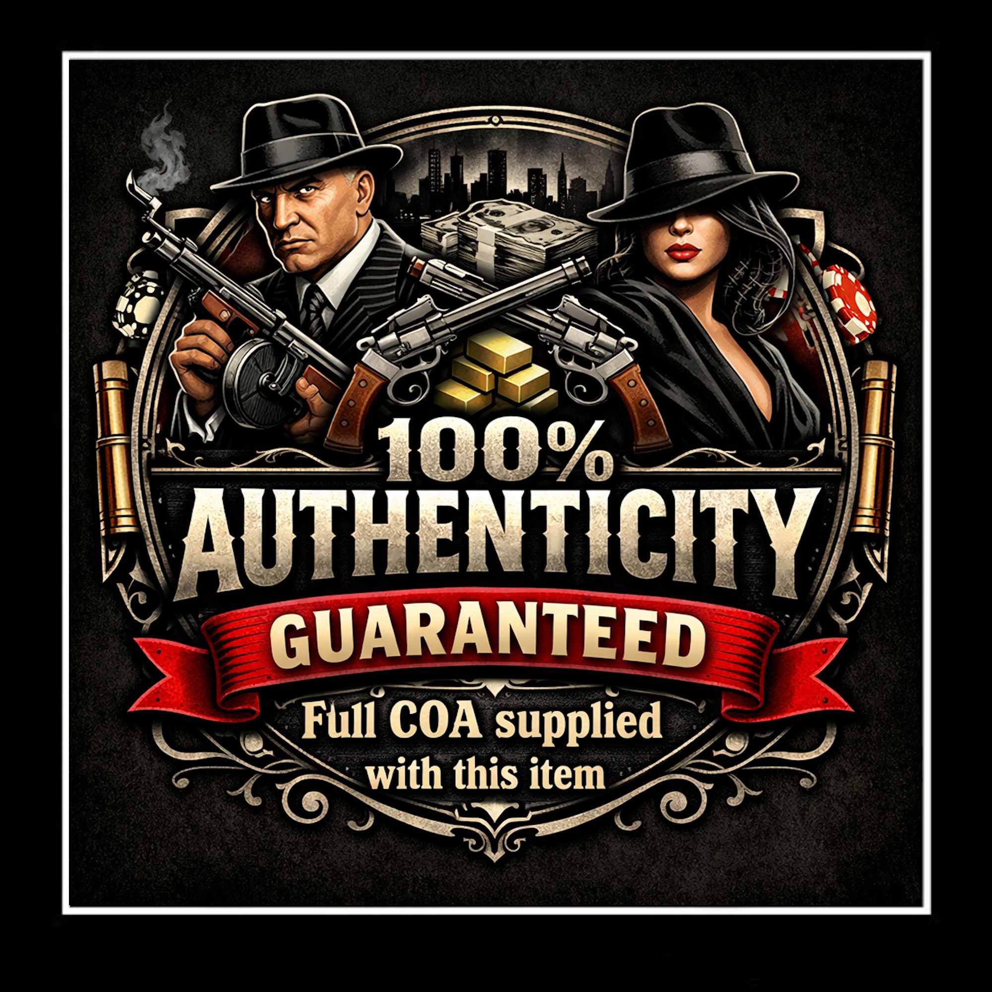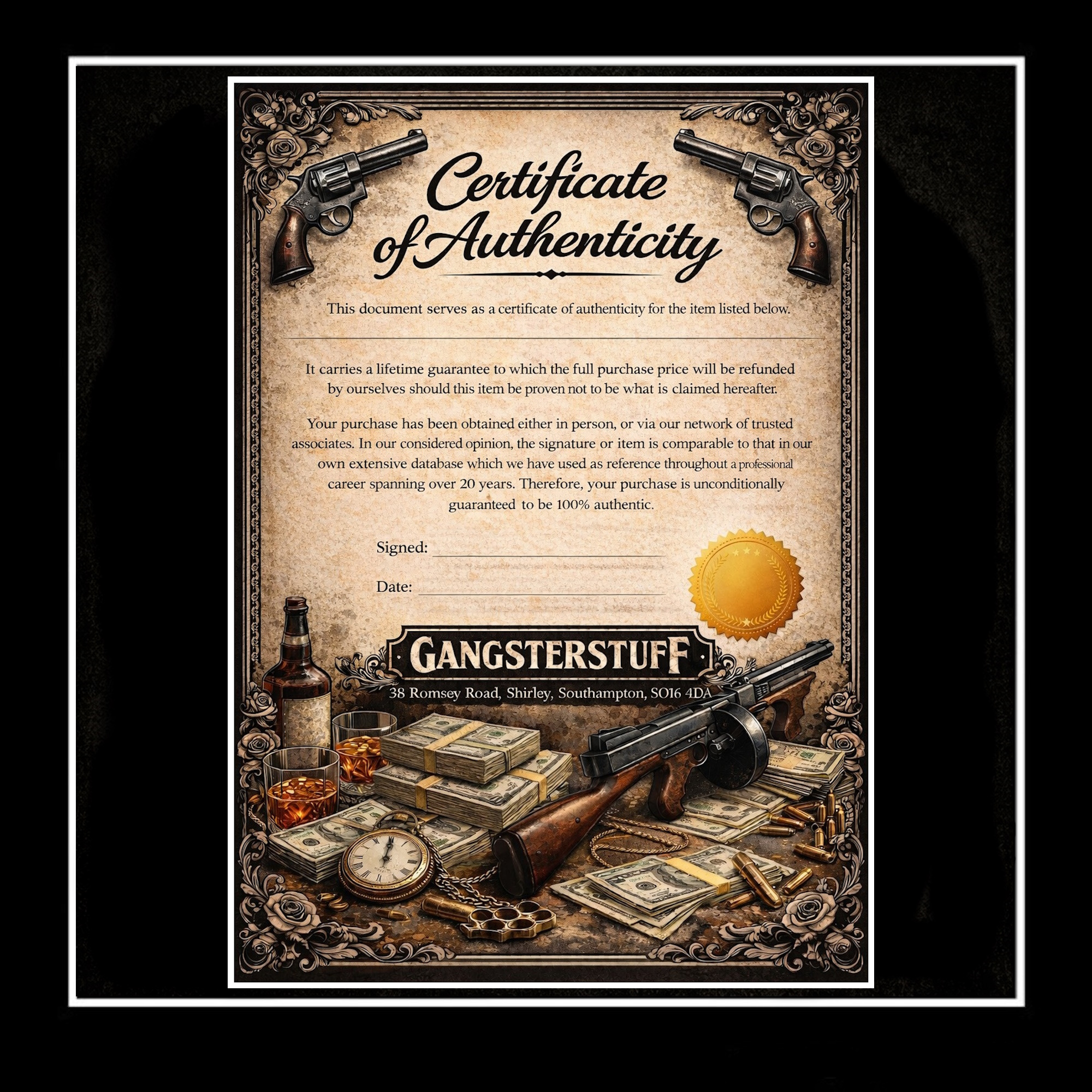 This item is guaranteed to be 100% authentic and has been hand-signed by Mad Frankie Fraser himself. Ideal for serious collectors seeking genuine underworld memorabilia. Our full COA is supplied giving this items authenticity a lifetime guarantee.