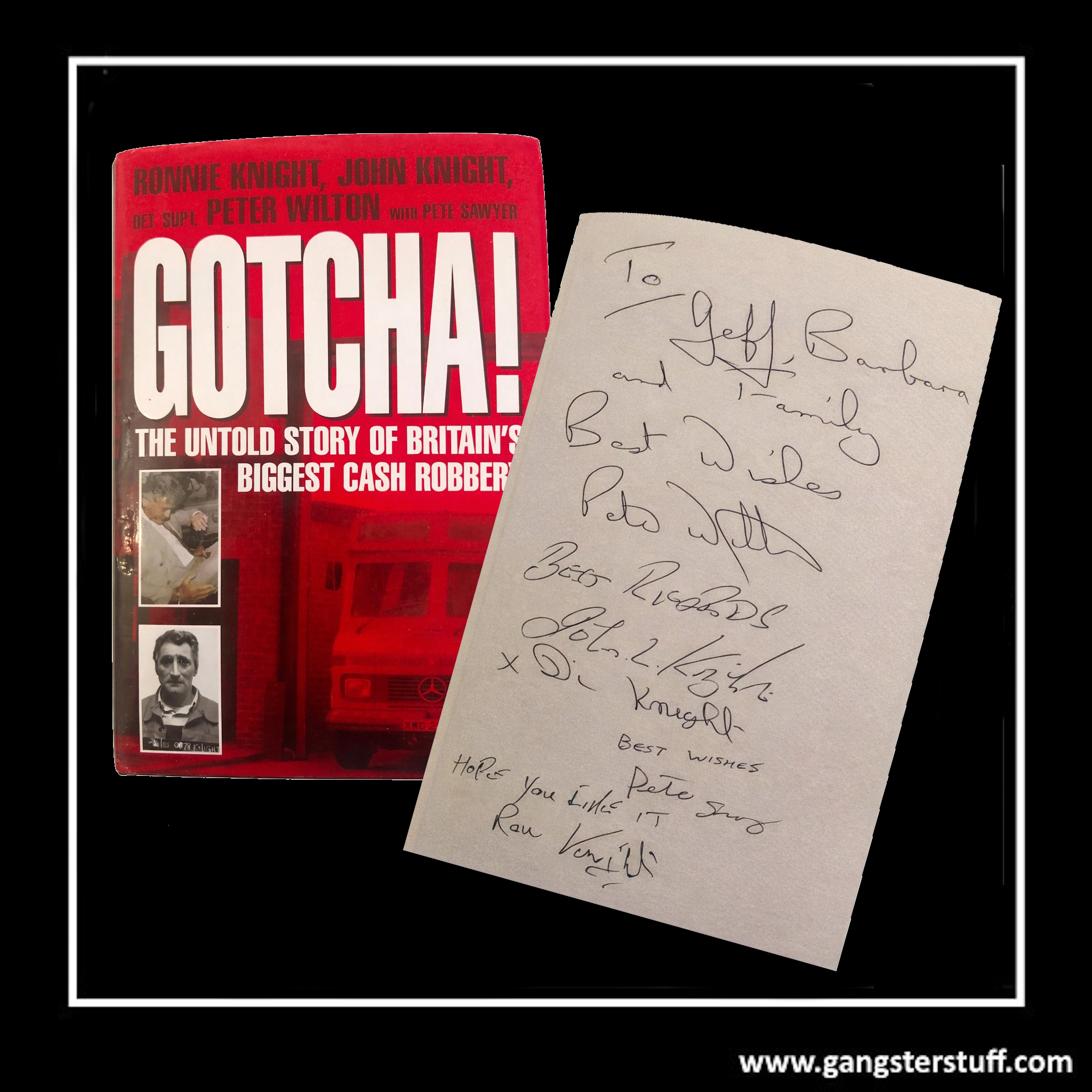 This is an exceptionally rare, fully authentic, multi-signed hardback copy of GOTCHA! – The Untold Story of Britain’s Biggest Cash Robbery, one of the most important books ever published on British organised crime. What makes this copy truly special is the unique combination of signatures contained within a single volume – bringing together both sides of the 1983 security express robbery story.