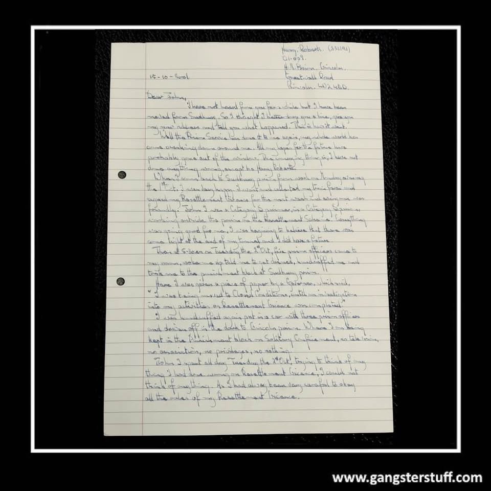 • Original handwritten content in Roberts’ own hand – not a lot of Harry Roberts memorabilia about