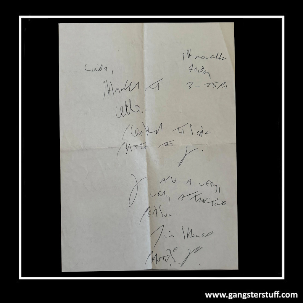 A highly collectible double-sided handwritten letter from Reginald Kray, one half of Britain’s most infamous gangster duo, The Kray Twins. Penned in Reg’s instantly recognizable hand, this letter offers a genuine glimpse into his personality and charm. Written from prison, Reg thanks a correspondent named Linda for her letter and photos, complimenting her and sharing a few reflections about his situation. The reverse side continues in Reg’s casual, personable tone — discussing his writing routine, the number of letters he receives, and his intention to reply when he can. The page concludes with his warm trademark sign-off – “Take it easy, God bless friend, Reg Kray.”