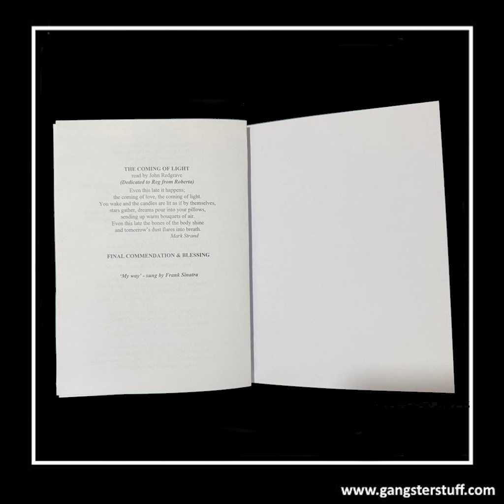 This is a high-quality replica copy of Reg Kray’s funeral Order of Service, faithfully reproduced to exactly match the original design issued at Reginald Kray’s funeral in October 2000.The replica has been carefully recreated using accurate layout, typography and formatting, making it an excellent display piece for collectors of Kray Twins memorabilia, British crime history enthusiasts, or fans of true-crime ephemera.